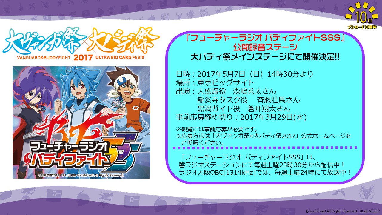 Uzivatel 公式 バディファイト開発局 Na Twitteru 大ヴァンガ祭 大バディ祭17にて フューチャーラジオ バディファイトsss 公開録音ステージが開催予定 蒼井翔太さん 斉藤壮馬さん 森嶋秀太さんが登場 観覧には事前応募が必要です Urlからチェック